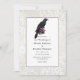 Convite de casamento gótico preto e roxo com um corvo decorado com rosas e um fundo de rendas com um padrão de harlequin damask inverso.