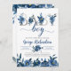 Este é um convite de chá de fraldas moderno para garotos modernos apresenta flores azuis marinhos profundas e folhas prateadas em estilo boho