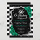 60º Convite de aniversário. Elegante design verde-esmeralda floral com prata brilhante e rosas. Apresenta faixas pretas e brancas e fontes de script. Perfeito para uma comemoração de dia das mulheres na moda. Pode ser personalizado para qualquer idade! Impressos convites Zazzle ou modelo de impressão digital instantânea para download.