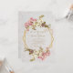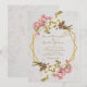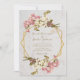 Este convite de casamento floral geométrico combina várias tendências de 2019: geométrico, mármore e metálico (dourado). Seu quadro irregular tem buquês de flores brancas e rosadas para cima e para baixo sobre dois polígonos dourados com sobreposição. Os nomes dos noivos estão escritos em uma elegante caligrafia, também usada para a última linha. As flores rosa e branca retrô são de um cartão-postal antigo de Bertha Maguire (1862-1910), agora em domínio público.