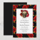 O convite de casamento Gótico Crimson vermelho com um crânio decorado com rosas vermelhas e um padrão dramático de rosa.