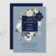 Este convite para o casamento de na moda apresenta um quadro de flores azuis marinhos náuticas, azuis claros e cor-de-rosa pincelada com folhas bege verde e neutro, sobre um fundo azul macio e empoeirado. O verso do convite é azul marinho escuro.