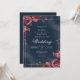 Flores vermelhas profundas e ricas enquadram um fundo naval sombrio, criando uma atmosfera dramática e elegante. Este design evoca um senso de romance refinado e charme sofisticado. É perfeito para uma união clássica e atemporal.