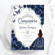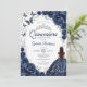 Navy silver and white floral Quinceanera celebration invitation. Features brunette girl in ball gown dress, script font, silver butterflies, watercolor roses and tiara. Perfect for an elegant princess style glam celebration. Personalize with your own details. Printed Zazzle invitations or instant download digital printable template.