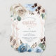 Esta moda e belo convite para o casamento apresenta flores de aquarela em tons neutros, beige, marfim, poeirentos e azuis e elegantes scripts de caligrafia de rosa de ouro falso e sotaques florais.