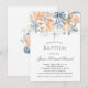 Batismo Bebê/Convite de Natal. Este design apresenta uma ilustração aquarela de pêssego pálido e flores azuis esfregando com efeito de ouro confetti e cruz no topo