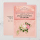 Um convite de aniversário com um buquê de rosas florais com flores brancas e rosas. Uma tiara de diamante falso. O fundo é rosa com um padrão floral. Desenho bonito e elegante.