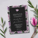 Sombras elegantes de púrpura, lavanda e branco, estes convites florais de borda magnólia mostram seus detalhes de casamento em letras brancas chicas contra um fundo preto. CORRESPONDENTE a itens na nossa coleção.