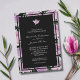 Sombras elegantes de púrpura, lavanda e branco, esses convites florais de casamento mostram flores de magnólia de cor d'água e seus detalhes de casamento em letras brancas chicas contra um fundo preto. CORRESPONDENTE a itens na nossa coleção.
