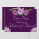 Será Minha Carteira de Honra? Dahlia Purple Lavanda Lilac Floral Wedding Matron de Honra. Lindas, elegantes, e modernas flores roxas escuras e leves da Dahlia com folhas verdes. Essas cores podem ser usadas para temas de casamento roxos e temas de casamento lavanda/lilás. Perfeito para um casamento de outono/outono, casamento de verão ou um casamento de primavera. Para itens correspondentes, copie e use este link ou entre em contato comigo na página 'Sobre'. https://www.zazzle.com/collections/purple_lavender_dahlias_floral_wedding_invitations-119455506708712978 Você pode personalizar e personalizar o texto, a cor do plano de fundo e mover as imagens onde quiser. Você também pode escolher a espessura e o tipo do papel.
