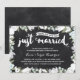 Este convite de aniversário de 25 anos de casamento elegante e moderno apresenta uma adorável caligrafia de pincel, lindas flores azuis e brancas, tipografia que diz "Casados (há vinte e cinco anos!)", e um fundo rústico de quadro-negro.