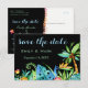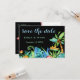 Este cartão postal colorido de Save The Date tropical é perfeito para o casal que terá um casamento na praia havaiana, um casamento na praia da Flórida ou um casamento na praia caribenha. Imagens em aquarela de hibiscos, folhas exóticas, ave-do-paraíso, flores tropicais, abacaxis e palmeiras em um fundo preto adornam o cartão na frente e atrás. Este convite apresenta azul, verde, rosa, laranja, amarelo e vermelho. Personalize o texto para um cartão personalizado. Veja minha coleção completa "Tropical Floral Wedding" para mais itens que você possa precisar para o seu casamento tropical exótico!