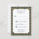 © Socialite Designs. Nosso cartão de resposta para eventos tem um damasco dourado falso texturizado em um fundo azul marinho (Hex - #152946) e um desenho de floreado dourado falso texturizado. Combine este cartão de RSVP elegante com o convite de casamento correspondente.