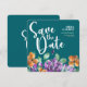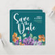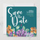 Flores amarelas roxas Salvem A data apresenta flores de fotograma arredondadas feitas com na moda d'água. Atmosfera púrpura e verde para seu tema de casamento criativo e sagrado. Versão Tosca Salvar a Data.