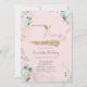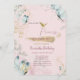 Este primeiro convite de aniversário com borboletas azul-aquarela, e flores em fundo rosa.