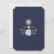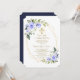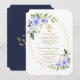 Design de cartão elegante com flores azuis de cor aquosa e folhas verdes, formas falsas de ouro, cruz fina de ouro, sobre fundo branco. Nas flores traseiras, divisor floral buquê, cruz dourada, iniciais, sobre fundo azul-da-noite. Use a ferramenta Personalizar para adicionar suas informações, alterar fontes, cores da fonte. Para encontrar itens, por favor, visite minha Santa Coleção de Comunhão.