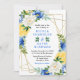 Este convite de casamento divertido e caprichoso apresenta flores azul aguarela, amarelas e brancas com folhagem em uma moldura geométrica dourada. O texto combina fontes manuscritas e serifadas para um visual elegante e moderno. Isso é perfeito para um casamento rústico de primavera ou verão.