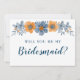 Este casamento impresso personalizado você será meu cartão estilo de convite da damas de honra... que apresenta uma ilustração floral no estilo aquarela em tons mais suaves de azul e laranja, fazer-os perfeitos para o outono ou outono e eventos especiais. As costas destes cartões são azuis-claros com um motivo de flor correspondente. Use os campos de modelo para personalizar facilmente essas placas dama-você-ser-minha-ponte com suas informações. Tem mais informações que você precisa incluir? Selecione a opção PERSONALIZAR para adicionar texto adicional a esses convites de damas de ponte.