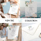 Elegante convite de casamento botânico temido com decoração de flores azul e rosa e folhagem verde elegante nas esquinas. Os detalhes do casamento e o nome da noiva e noiva são apresentados elegantemente numa fonte de serifa. Cartão inverso em azul pastel com flores.