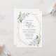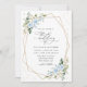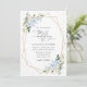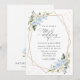 Convide amigos e família em estilo e dê o tom para seu dia especial com este encantador convite para o casamento. Design apresenta flores azuis e brancas de aquarela, verde, confete dourado e moldura dourada sobre fundo branco.