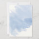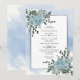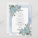 Flores azuis poeirentas de aquarela e deixa casamento no inverno floral Convite. Este elegante design apresenta uma moldura prateada e flores azuis empoeiradas de cor d'água com folhas suculentas e eucaliptas nos cantos superior esquerdo e inferior direito e seu texto em cinza e preto. Atrás do quadro há um plano de abertura de cor da água azul.