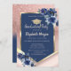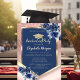 boné de formatura brilhante Dourado e flores azuis num fundo ombre de rosa dourado.