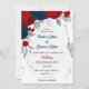 Vermelho escuro romântico e flores azuis marinhos com folhas prateadas convite de casamento botânico Os detalhes da brilha são simulados. É adequado para casamento e festas de noivado.