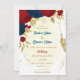 Vermelho escuro romântico e flores azuis marinhos com folhas de ouro convite para casamento botânico Os detalhes da brilha são simulados. É adequado para casamento e festas de noivado.