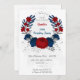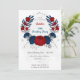Vermelhos escuros românticos e flores azuis marinhos com folhas prateadas convite de aniversário botânico Os detalhes da brilha são simulados.
