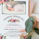 Adorável convite à cerimônia de nomeação com uma foto do seu filho. O convite apresenta buquês de rosas e híbridos em rosa e burgundy.