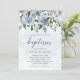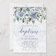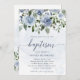 Estes encantadores convites Baptismos apresentam um bonito buquê de poeirentos flores azuis aquáticas, elegante tipografia moderna, e uma lavagem de aquarela azul na moda. Um belo olhar floral.
