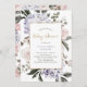 Este convite para chás de fraldas lindo e moderno apresenta lindas flores hipnórdicas femininas, cor-de-rosa e roxo, com falso roteiro e tipografia dourados. A parte de trás do convite apresenta uma bonito aquarela floral.
