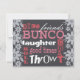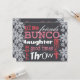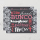 Convide sua família e amigos para uma noite cheia de diversão. O design gráfico apresenta arte de metrô com palavras associadas a Bunco: dados, amigos, risos, bate-papo. bons tempos, jogar e rolar. A cor de fundo pode ser alterada. A fonte no lado do texto pode ser alterada. Continue jogando Bunco!