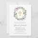 Este simples e elegante convite religioso neutro para a Primeira Comunhão apresenta uma coroa de flores bonito brancas e de cinza macia, folhagem verde e folhas de eucalipto, sobre fundo branco. Uma cruz de aparência de ouro falsa também é apresentada.