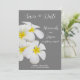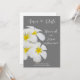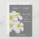 Um design floral suave e delicado, com flores brancas havaianas Frangipani ou Plumeria, sobre um fundo de cinza médio. Escrita elegante que acentua as elegantes flores brancas e amarelas. Um pacote de convite perfeito para o casamento na praia, casamento havaiano, casamento de destino na ilha tropical e muito mais.