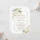 DOWNLOAD DIGITAL DISPONÍVEL A PEDIDO. Design de cartão elegante, com flores brancas delicadas e folhas verdes, cor d'água, cruz e quadro dourados falsos, divisor floral, sobre fundo branco. No buquê das flores brancas. Use a ferramenta Personalizar para adicionar suas informações, alterar fontes, cores da fonte. Para obter itens correspondentes, visite minha nova coleção de celebrações Baptism/Christening.
