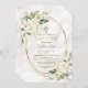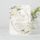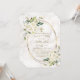 Design de cartão elegante, com flores brancas delicadas e folhas verdes, cor d'água, cruz dourada falsa e estrutura oval falsa, divisor floral, sobre fundo mármore quico. Na parte de trás buquê e cruz de flores brancas, no mesmo mármore chic. Use a ferramenta Personalizar para adicionar suas informações, alterar fontes, cores da fonte. Para obter itens correspondentes, visite minha nova coleção de celebrações Baptism/Christening.
