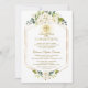 Design de cartão elegante com flores brancas delicadas, cor d'água, falso quadro quebrado com brilho dourado, cruz, sobre fundo branco. Na parte de trás, buquê de flores brancas, cálice de ouro e iniciais. Use a ferramenta Personalizar para adicionar suas informações, alterar fontes, cores da fonte. Para encontrar itens, por favor, visite minha Santa Coleção de Comunhão.