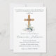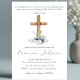 Este elegante convite de batismo personalizado floral apresenta uma imagem de aquarela religiosa no centro. Uma cruz de madeira é acentuada com flores brancas e azuis, e delicada verde. Por cima da cruz de madeira, é impresso um verso de bíblia para batismo.