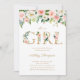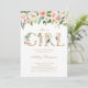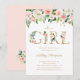 É uma garota! Convide familiares e amigos para o seu evento com este elegante convite para chás de fraldas florais. Apresenta cor de pêssego pincelada e flores brancas com letras florais de folha de ouro falsas. Personalize adicionando nomes, data, hora, local e outros detalhes. Este convite para chás de fraldas florais é perfeito para chás de fraldas de primavera e jardim.