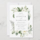 Convite de casamento elegante e botânico com detalhes de seu casamento moldado por flores de jardinagem branca pintadas, ranhuras de hálito de bebê, folhas verdes de sage e folhas verdes vibrantes. Este convite de casamento floral branco é perfeito para casamentos de jardim e primavera ou casamentos de verão.