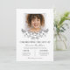 Serviço de memorial ou convite ao funeral, com uma fotografia do seu ente querido enquadrada por meia coroa de flores brancas e verde.