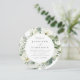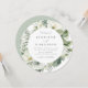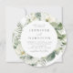 Elegante convite de casamento botânico com os detalhes do seu casamento cercado por flores pintadas de jardina branca, prigos de hálito de bebê, folhas verdes de sage e folhas verdes vibrantes. Este convite de casamento em círculo é perfeito para casamentos de jardim e casamentos de primavera ou de verão.
