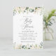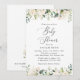 Convide amigos e família de estilo e dê o tom para seu dia especial com este charmoso convite para chás de fraldas. Design apresenta flores brancas de aquarela e verde em fundo branco.