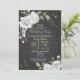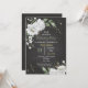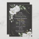 convite de festa de aniversário preto botânico com flores brancas sonhadoras e folhas verdes, os detalhes cintilantes são simulados