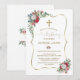 Design de cartão elegante com cor d'água buquês de férias de inverno (flores vermelhas e brancas, pinheiro, cones, bagas holly, dedos de mísseis, folhas de eucalipto), faux gold frame e uma caligrafia de "batizar" moderna e cruz, em fundo branco. Use a ferramenta Personalizar para adicionar suas informações. Para encontrar itens, por favor, visite a minha Encantadora coleção de eventos religiosos.