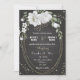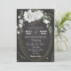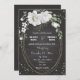 Lindas flores brancas com algumas folhas verdes em quadro oval contra convite de casamento em fundo preto Os detalhes de brilho são simulados