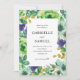 Este convite de casamento colorido apresenta uma borda de flores lacrimogêneas, verdes e roxas de aquarela e verde. O fundo é verde-sábio escuro.