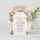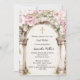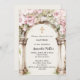 Um grande arco de mármore decorado com flores cor-de-rosa e uma cruz de ouro. Personalize e adicione um nome e detalhes.