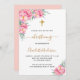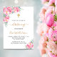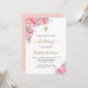 Um fundo branco decorado com flores cor-de-rosa. Personalize e o nome e os detalhes da cerimônia. Letras pretas e ouros coloridas. Traseira: cor de fundo embaçada.